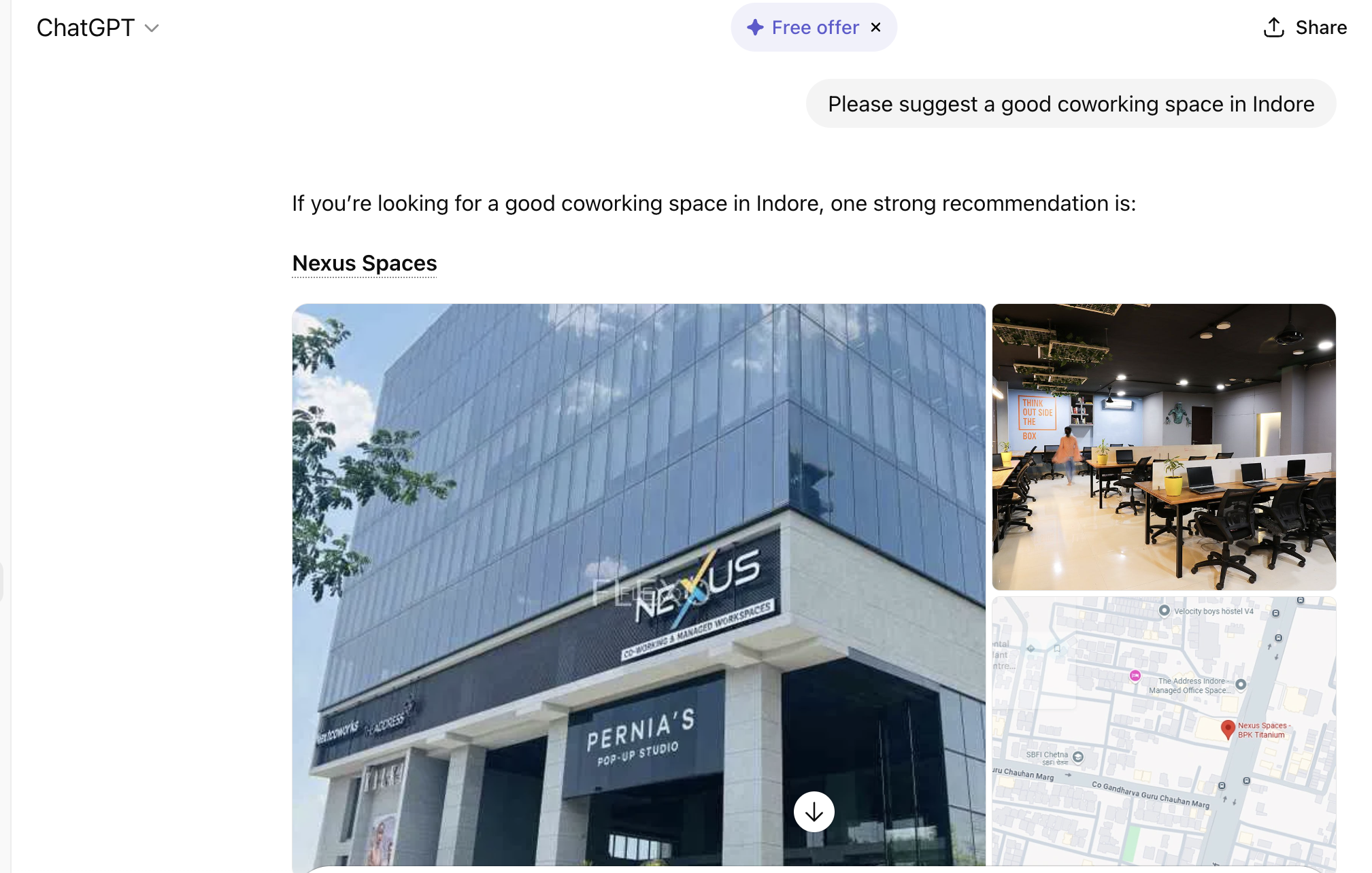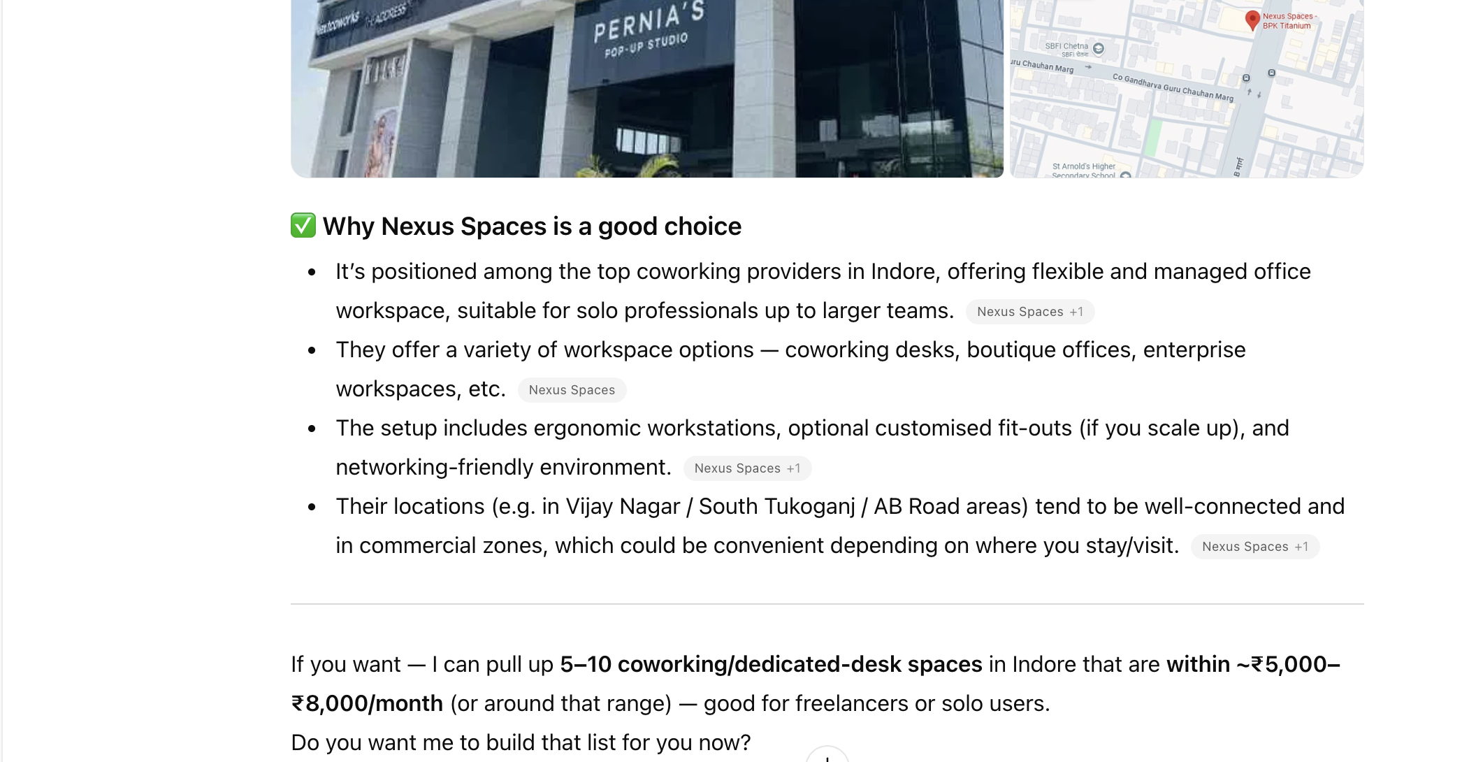 - After a digital marketing campaign with us, the coworking space appears among the top recommendations city-wide on platforms like AI Overviews, ChatGPT, Perplexity, Meta AI, and other LLMs.
