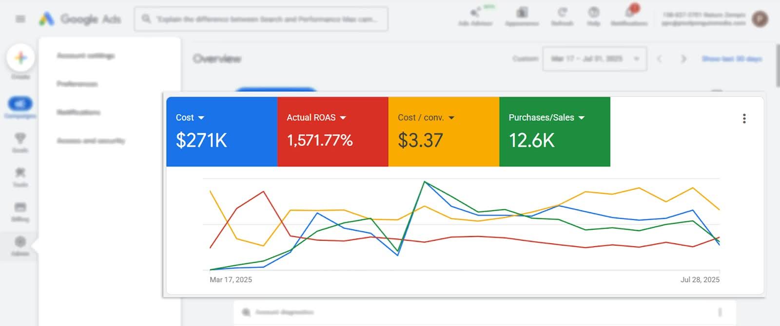 Between March and June alone, Google Ads generated $436K+ in Shopify revenue, growing from a $4.9K launch month to consistent six-figure monthly revenue at peak scale.