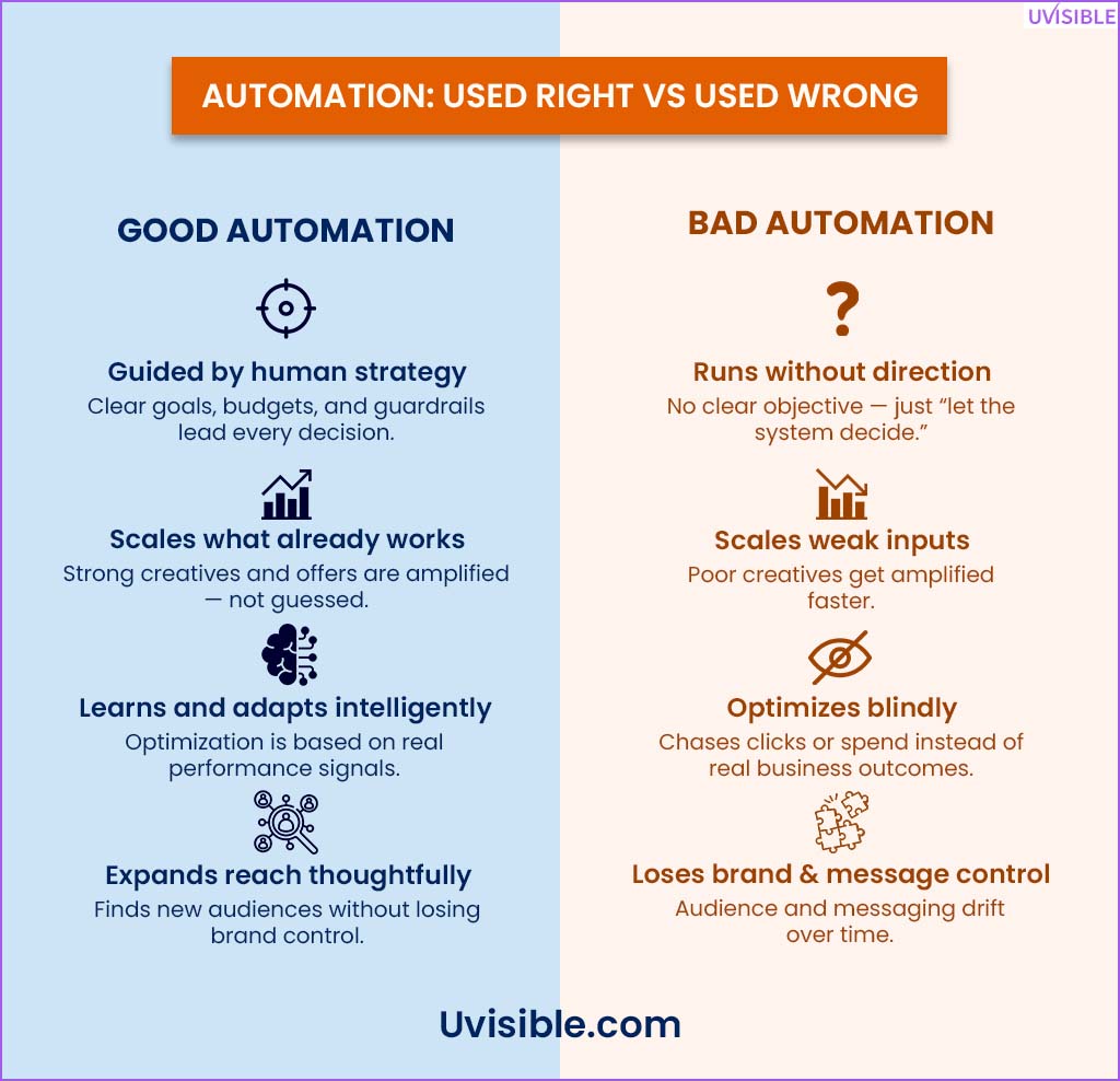 - Rising CPA on “automated” campaigns.